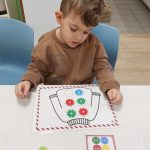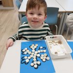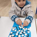 We werkten in ons klasje rond de prentenboeken van “Klein wit visje”. De kleuters kregen o.a. de kans om te spelen met allerhande zeedieren. Ze speelden ook een gezelschapsspelletje waarbij ze de visjes sorteerden volgens de juiste kleur. Er werden walvissen ingeschilderd, ze knipten en plakten een puzzel i.v.m. een visje, ze experimenteerden met scheerschuim op prenten van de zeedieren uit het verhaaltje. Wat is schrijfdans met scheerschuim leuk!
